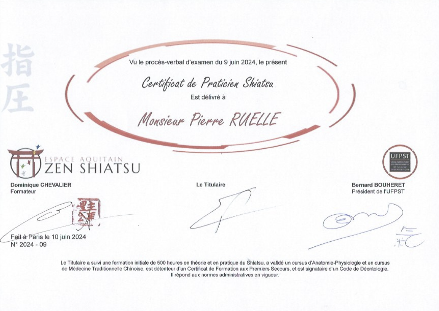 Important : Une séance de shiatsu ne se substitue pas à une consultation médicale. Seul un médecin peut établir un diagnostic, modifier ou suspendre un traitement.